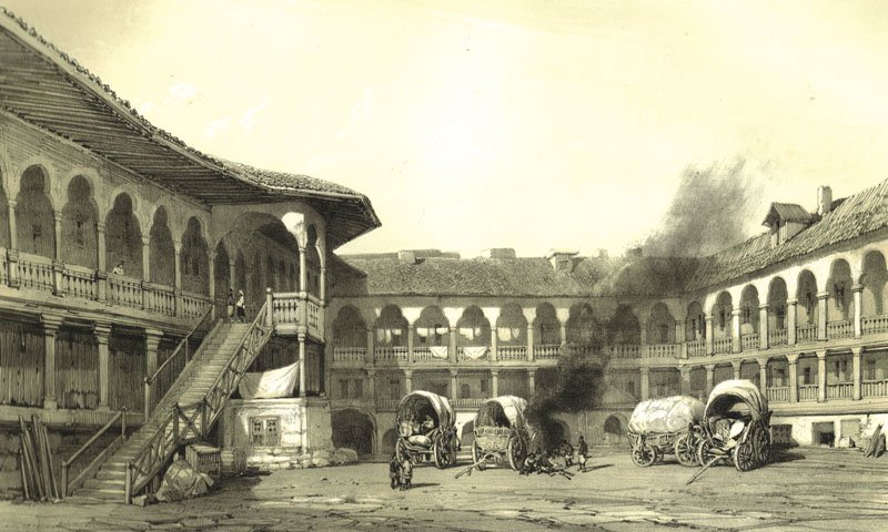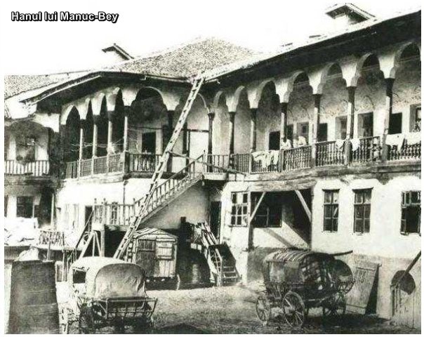 Manuc’s Inn, depicted by an engraving from 1841 (left) and a photograph from 1867–1870 (right).